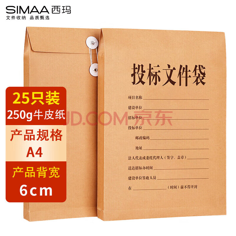 商品相册:西玛(SIMAA)25只 投标专用A4牛皮纸档案袋 250g加厚款/侧宽6cm 6629第