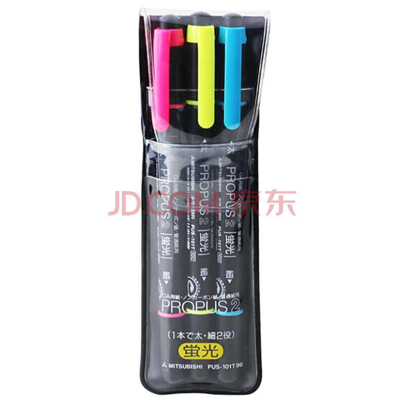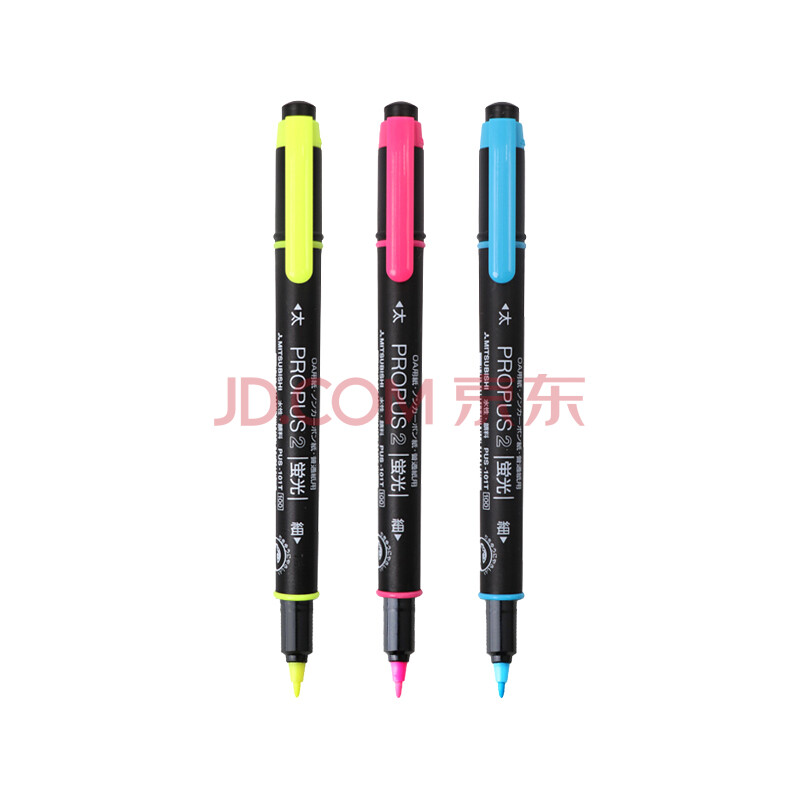 商品相册:uni三菱 双头荧光记号笔 学生作业标记笔彩色绘画记号笔 细0.5mm粗4mm PUS-101T(N) 3色套第