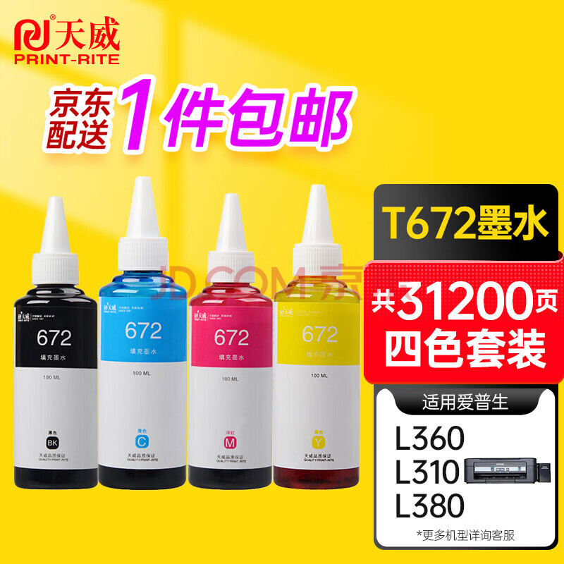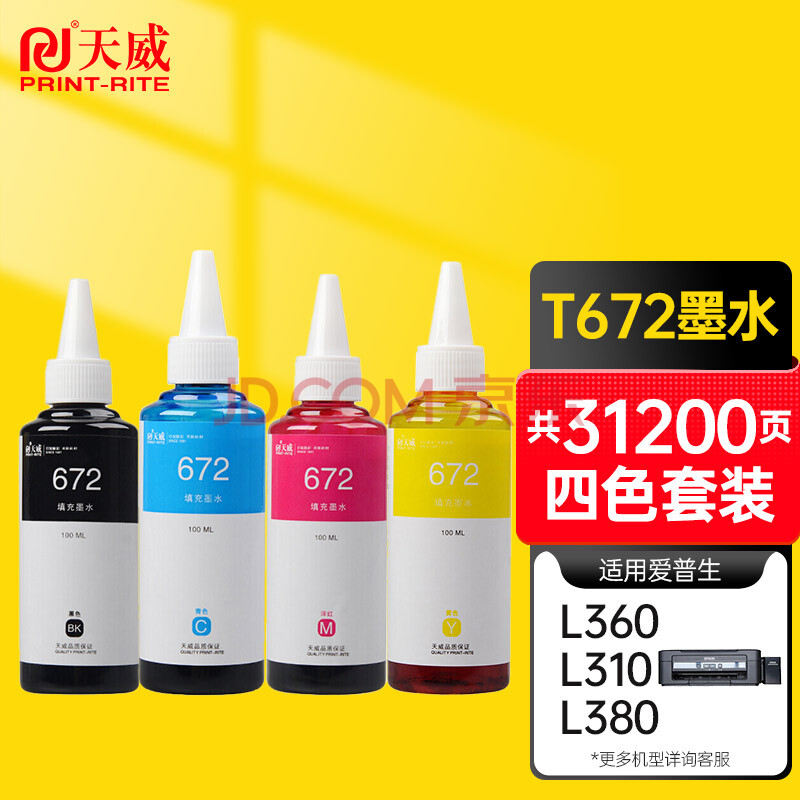 商品相册:天威 T6721-T6724墨水 适用L130 L1300 L383 L310 L551 l565 L360 M201 爱普生EPSON打印机 672墨水四色套装第