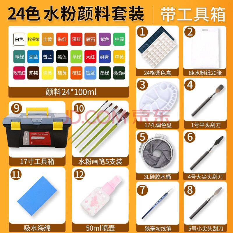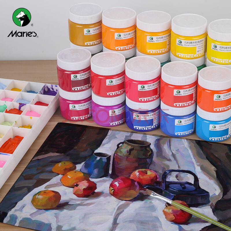 商品相册:马利(Marie's)水粉颜料套装24色100ml瓶装 水粉笔刮刀调色盘吸水海绵喷壶水桶水粉纸勾线笔调色盒工具箱套装美术写生第