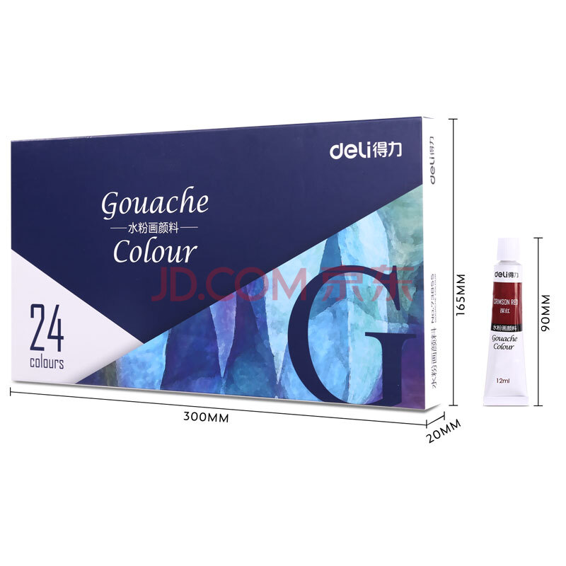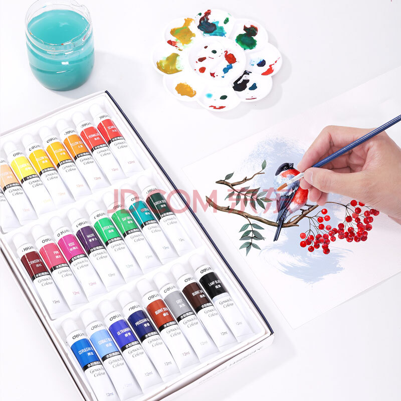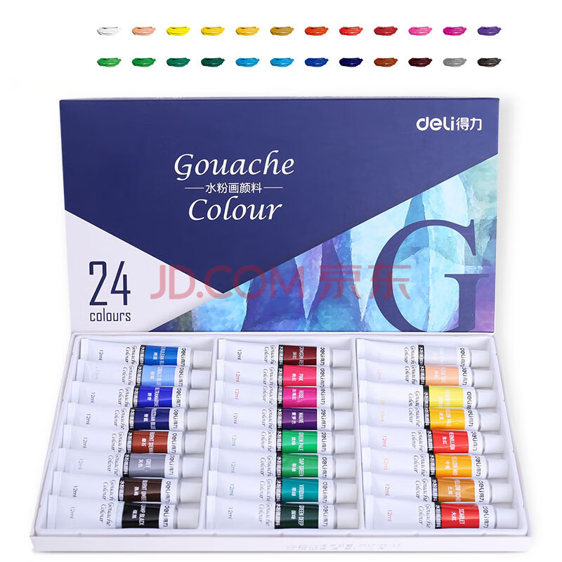 商品相册:得力(deli)水粉颜料24色12ml大容量美术专用水粉画学生儿童绘画彩绘套装便携礼物73855可水洗手搓颜料第