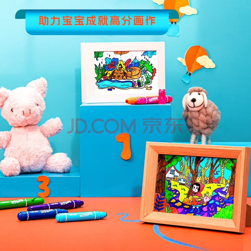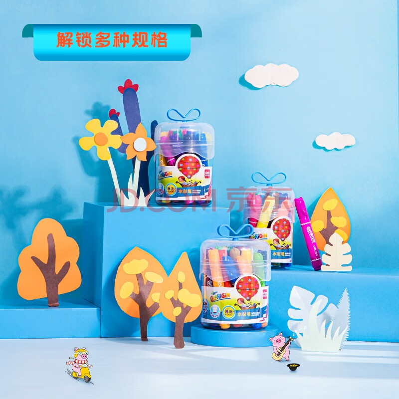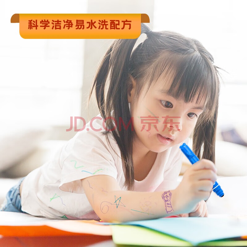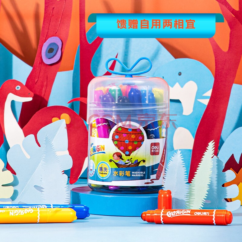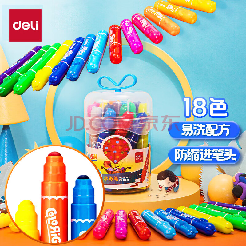 商品相册:得力(deli)18色幼儿园水彩笔易水洗宝宝专用安全圆头儿童软胶提手桶装绘画彩笔涂鸦笔70728第