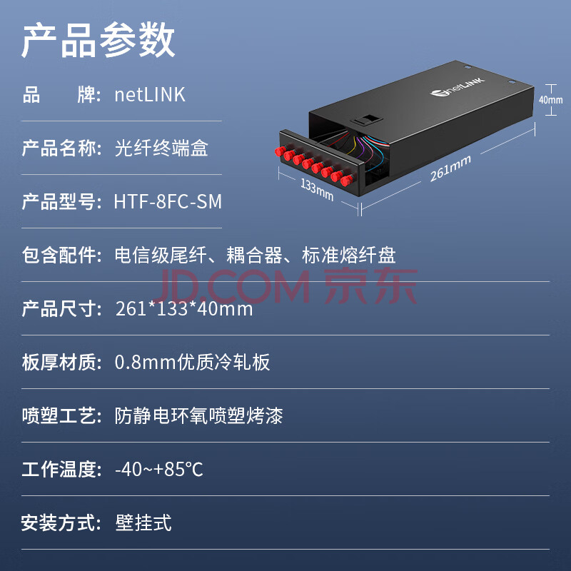 商品相册:netLINK光纤终端盒 8口8芯FC单模光纤熔纤盒 满配光纤尾纤法兰光缆接续盒 壁挂式1个 HTF-8FC-SM第