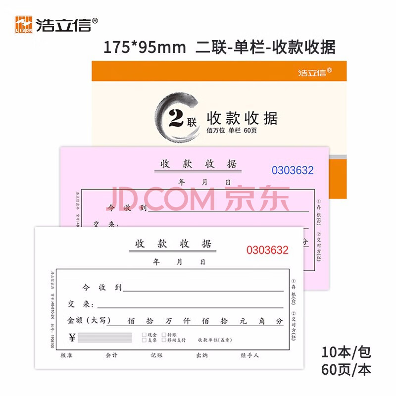 商品相册:浩立信 百万位单栏二联收款收据 财务单据 175*95mm 10本/包×60页/本 带撕裂线无碳复写 10本装1本30份第