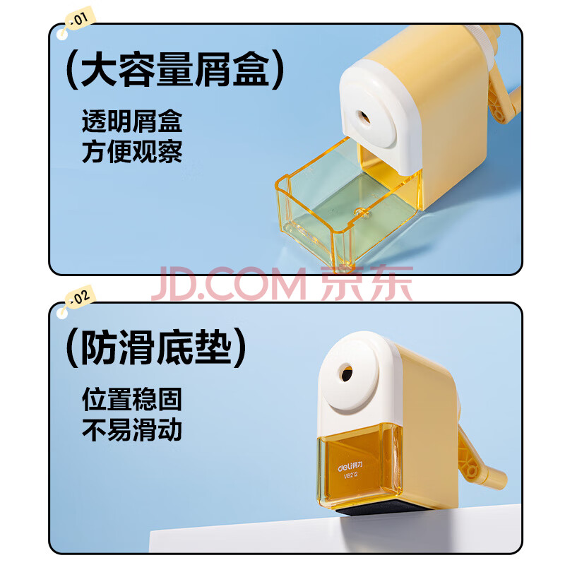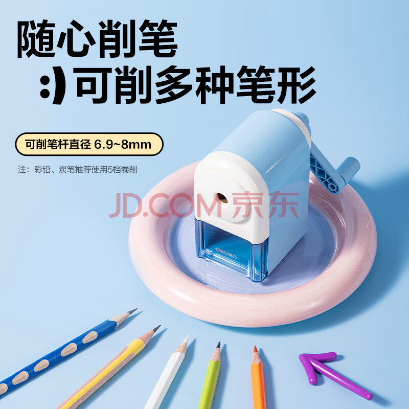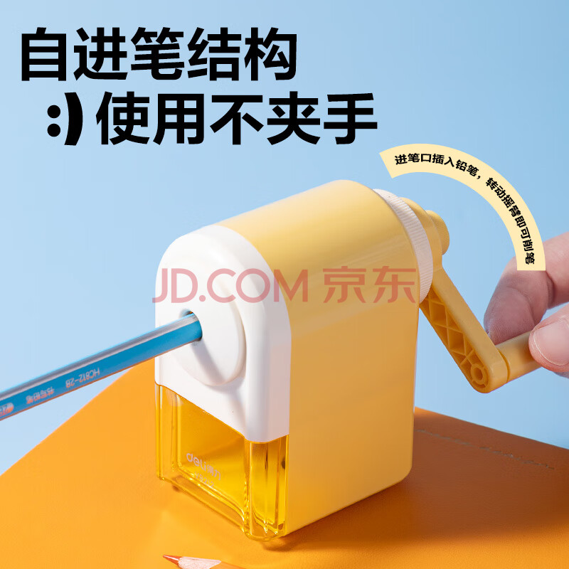 商品相册:得力(deli)【全网低价】简约手摇削笔机粗细可调卷笔刀自动进笔排断芯转笔刀削笔刀学生文具开学生日礼物蓝第