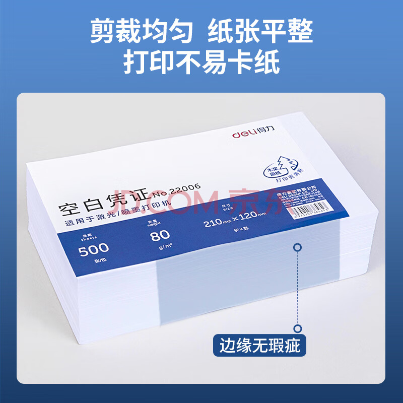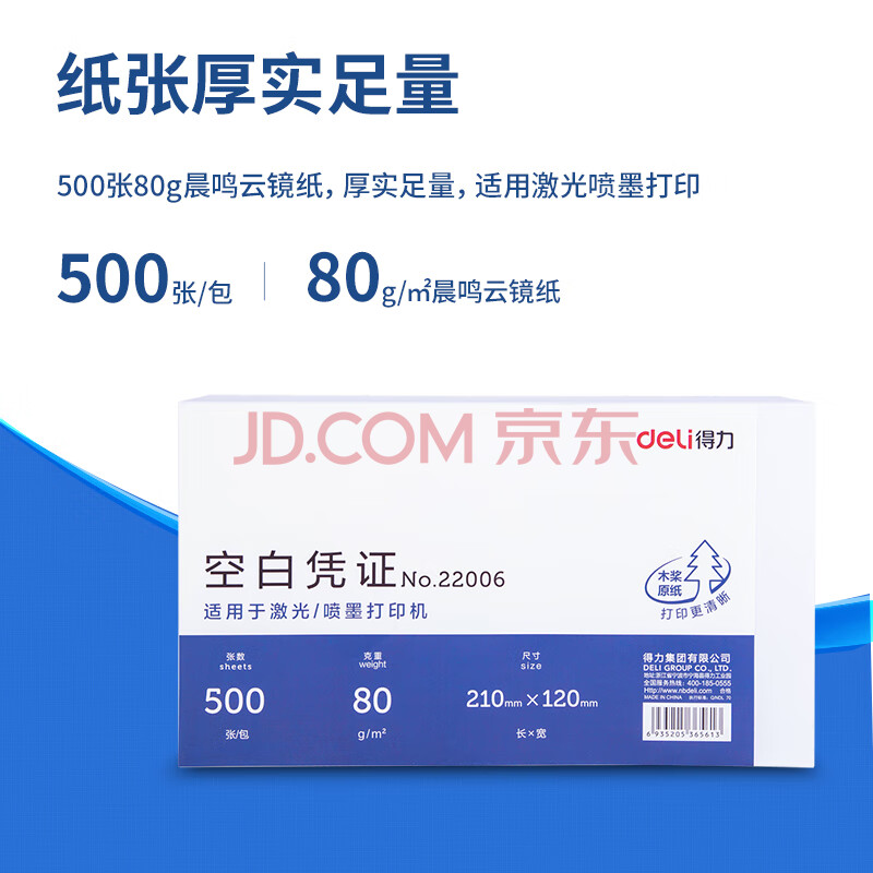 商品相册:得力(deli)优选80g晨鸣云镜空白单据凭证纸 适用于用友金蝶财务软件记账凭证打印纸 210*120mm 500张 22006第