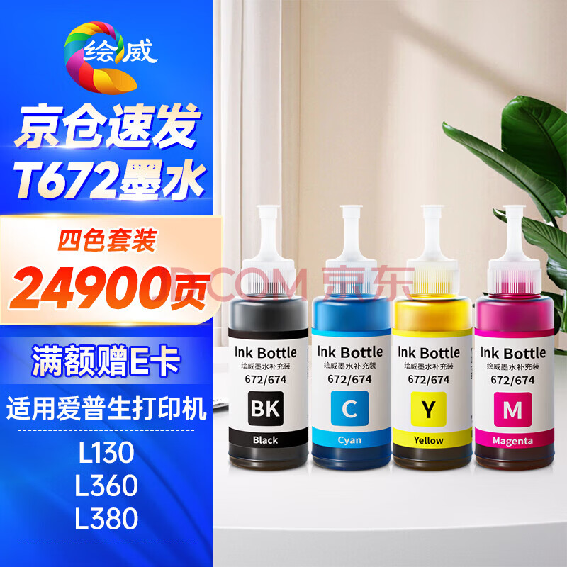 商品相册:绘威T672墨水 适用爱普生L360 L130 L380 L1300 L310 383 351 313 455 551 365 epson墨仓式打印机墨水 四色套装第