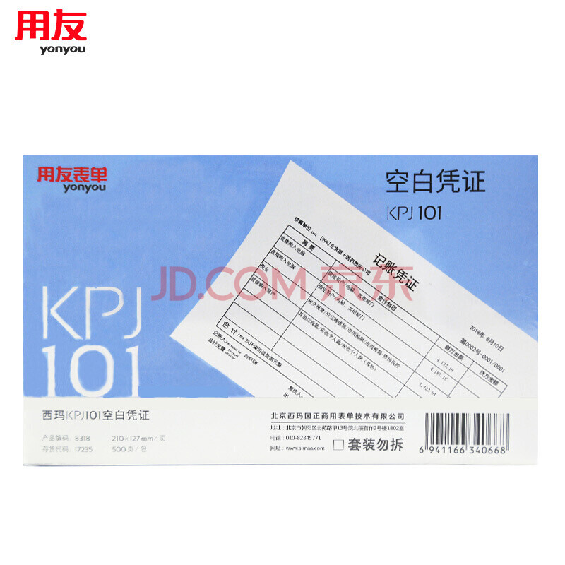 商品相册:西玛(SIMAA) 用友专业版KPJ101空白凭证 500份/包 210*127mm 8318 财务软件记账凭证打印纸第