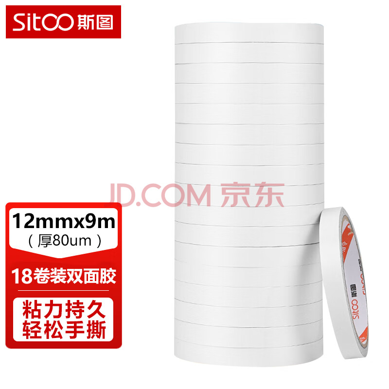 商品相册:斯图sitoo 高粘棉纸双面胶带 学生文具手工制作 12mm*10y(9.1m/卷) 白色小卷芯18卷装 办公用品第