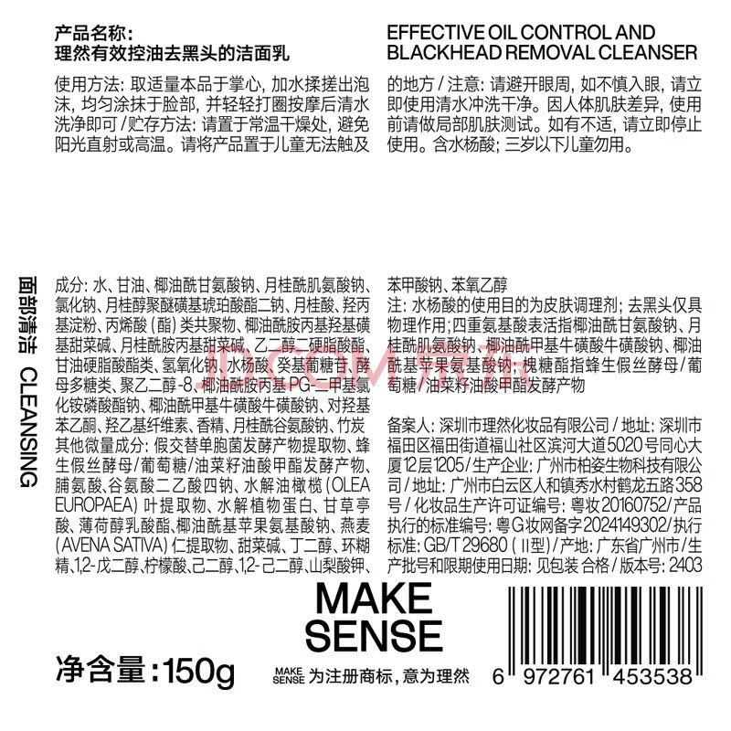 商品相册:理然男士控油氨基酸去黑头洗面奶 保湿补水去油洗面奶男大油皮150g*2第