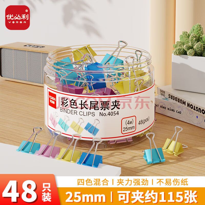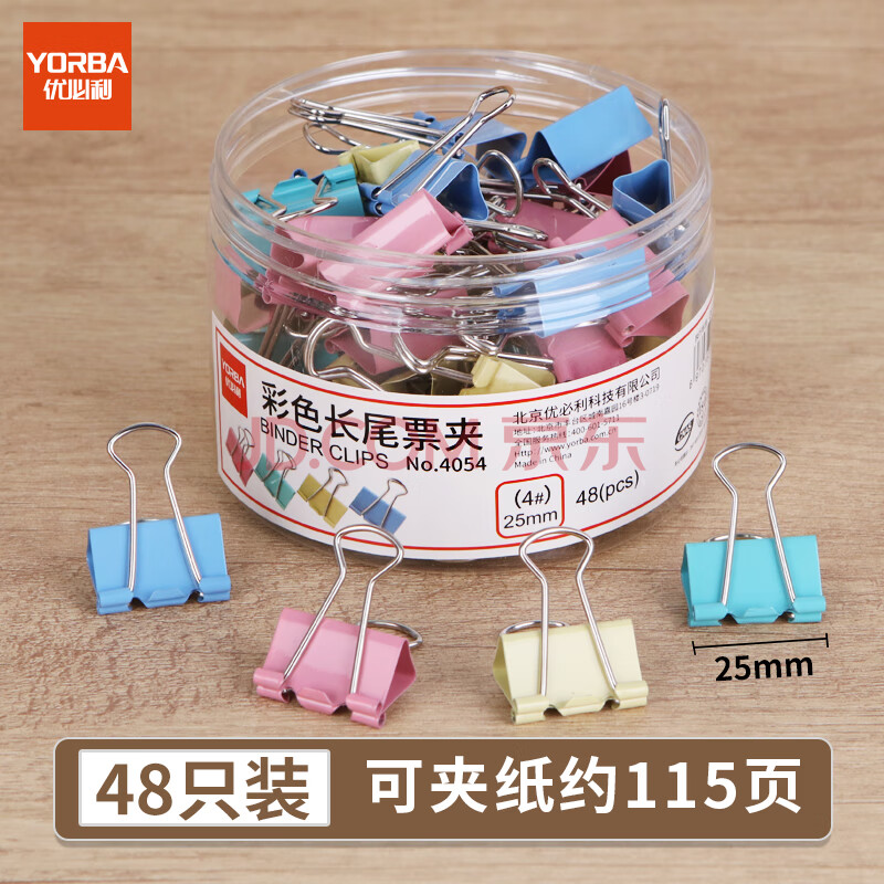 商品相册:优必利 长尾夹彩色燕尾夹金属铁夹凤尾夹文件夹蝴蝶夹小夹子 办公用品资料固定票夹 25mm48只/筒 4054第