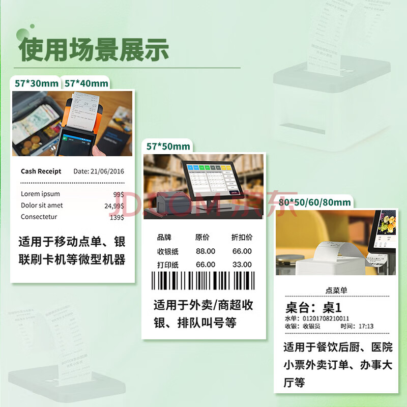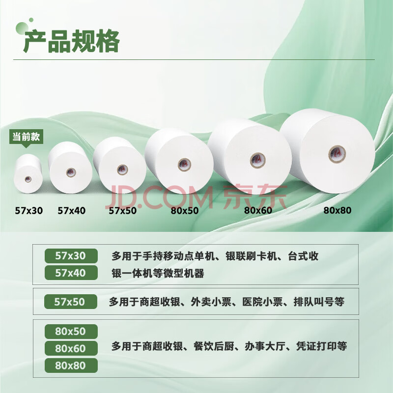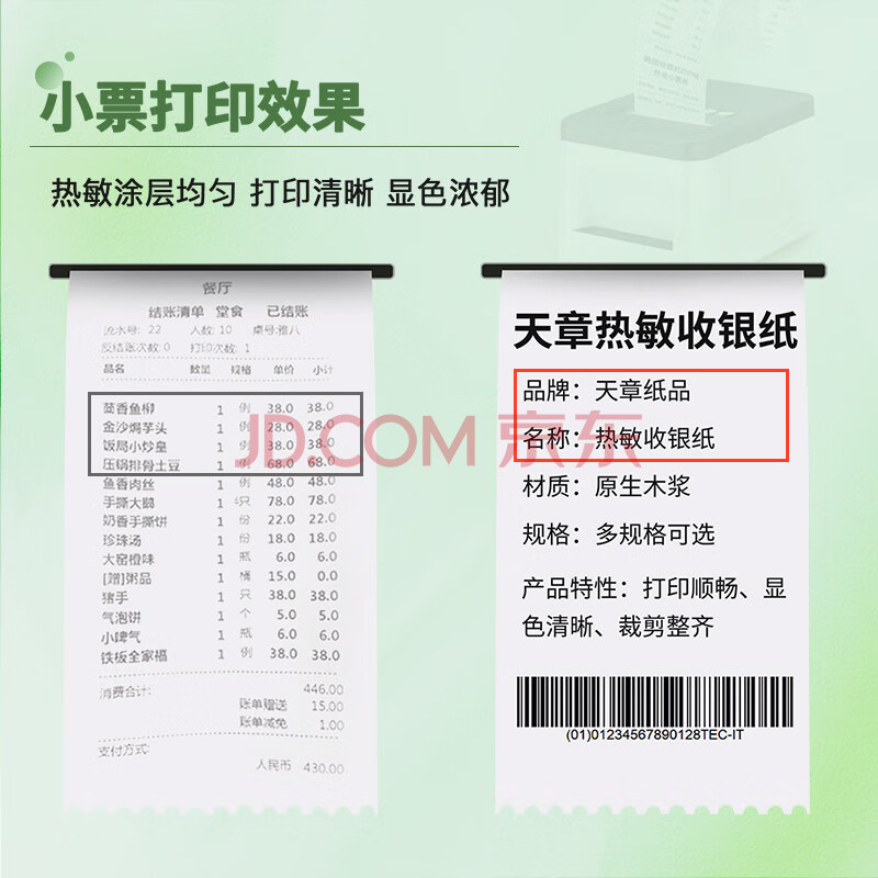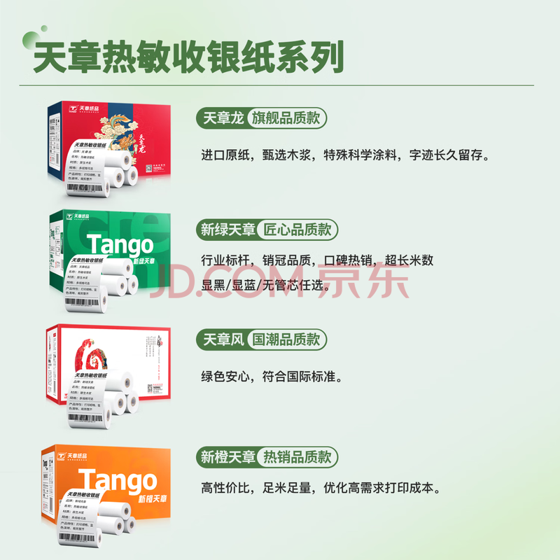 商品相册:天章 (TANGO)57*30mm5.2米*48卷新绿天章热敏收银纸 京东美团外卖餐饮小票纸 银联移动点单打印纸 适配58mm机器第
