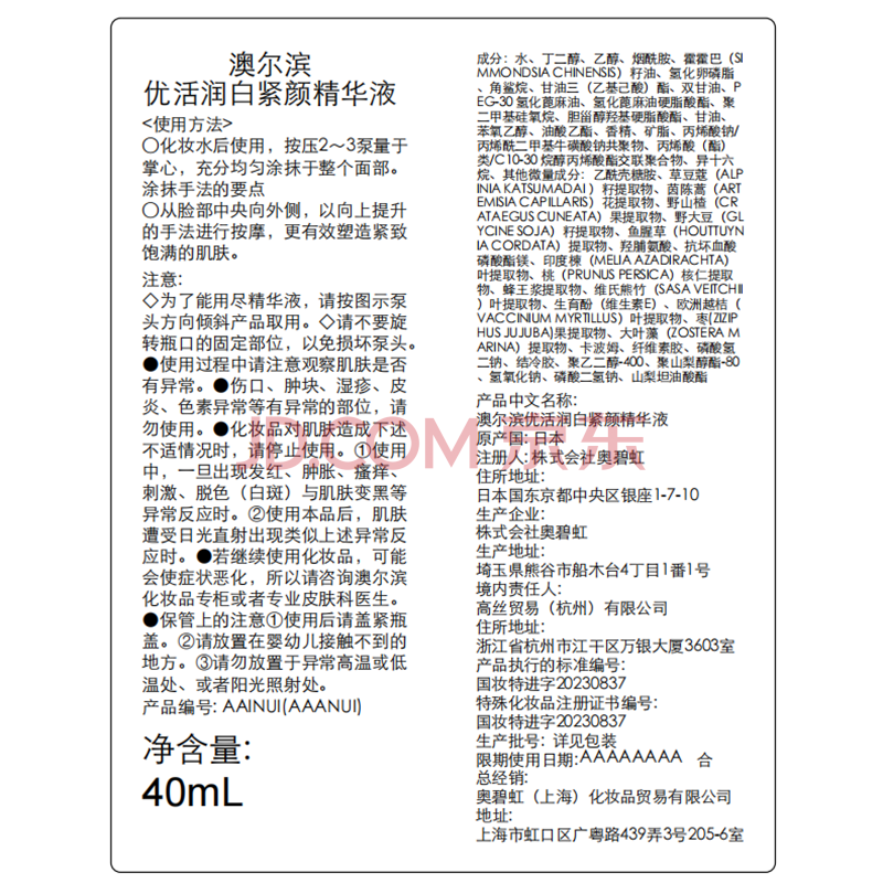商品相册:澳尔滨优活润白紧颜精华液40ml 美白保湿 紧致精华 提亮肤色 奥尔滨第