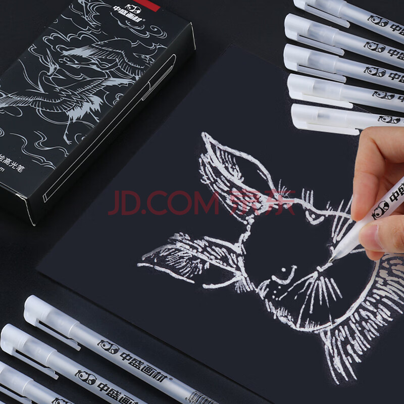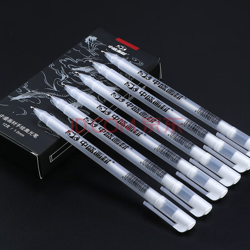 商品相册:中盛画材绘画高光笔水性白色波晒黑卡纸用笔设计-12支装白色笔芯黑底写白字细头水彩留白勾线笔美术写生第