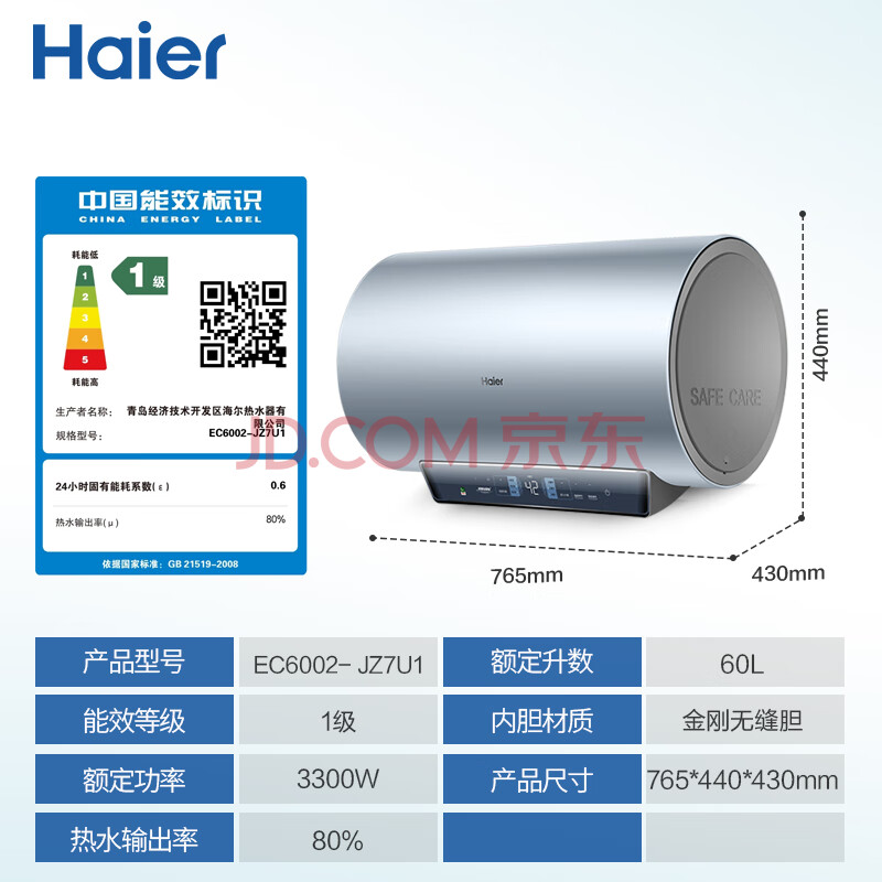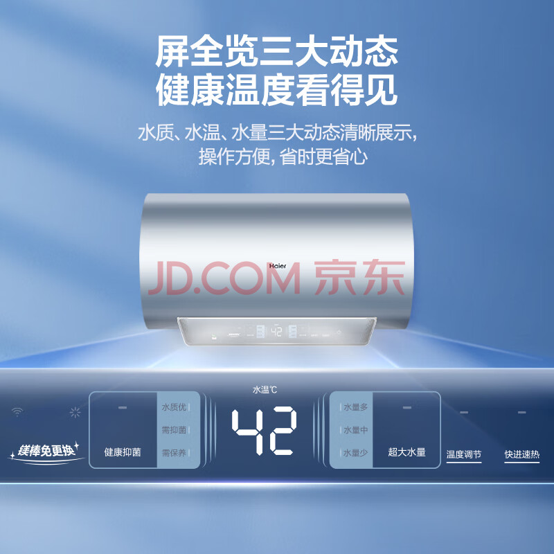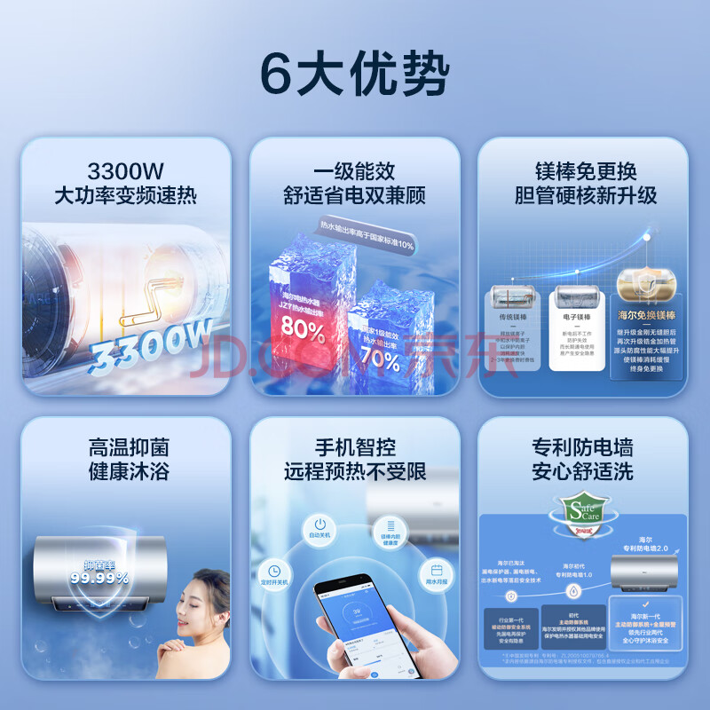 商品相册:海尔(Haier)【JZ7】60升电热水器 3.3KW/2.2KW变频速热 增容大水量 一级能效 水质可视 EC6002-JZ7U1 *第