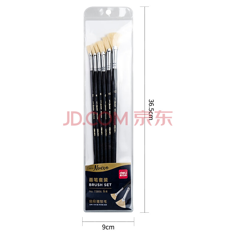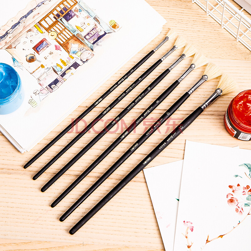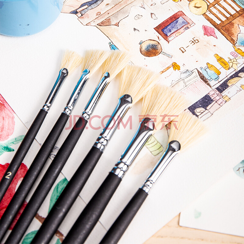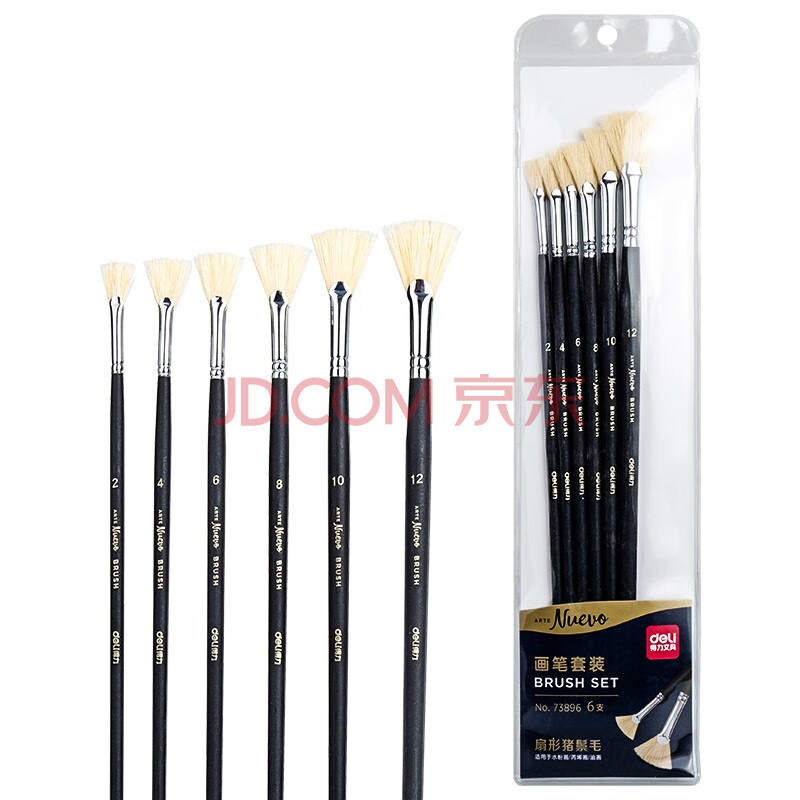 商品相册:得力(deli)6支(2#/4#/6#/8#/10#/12#)水粉画水彩画颜料猪鬃扇形画笔套装73896第