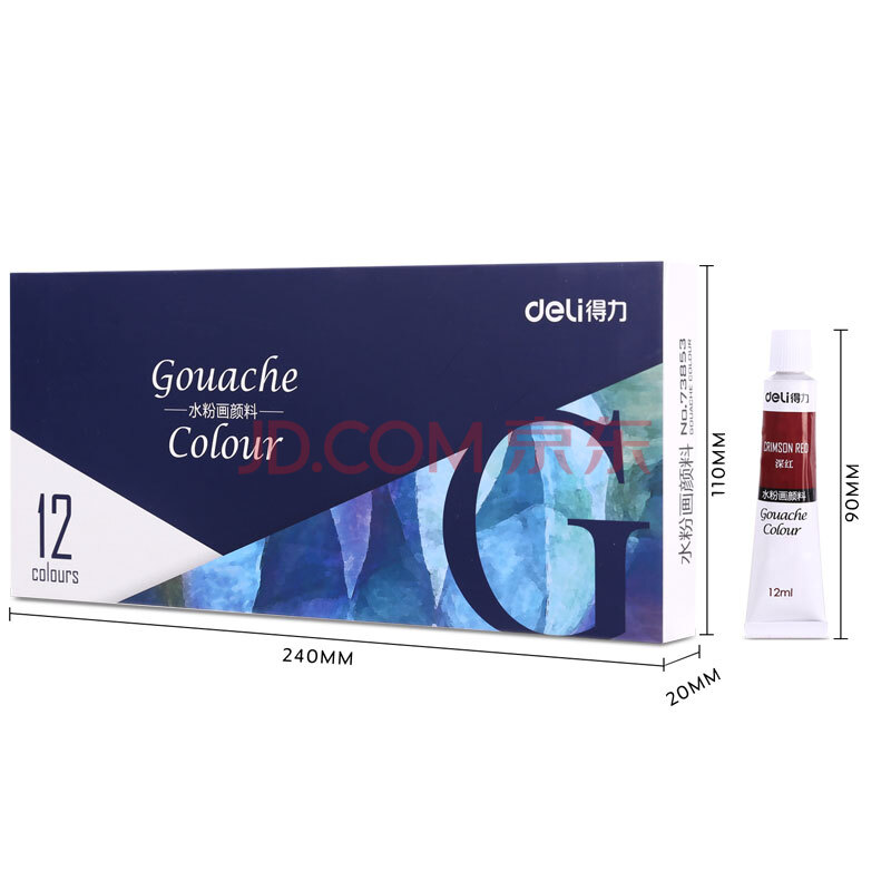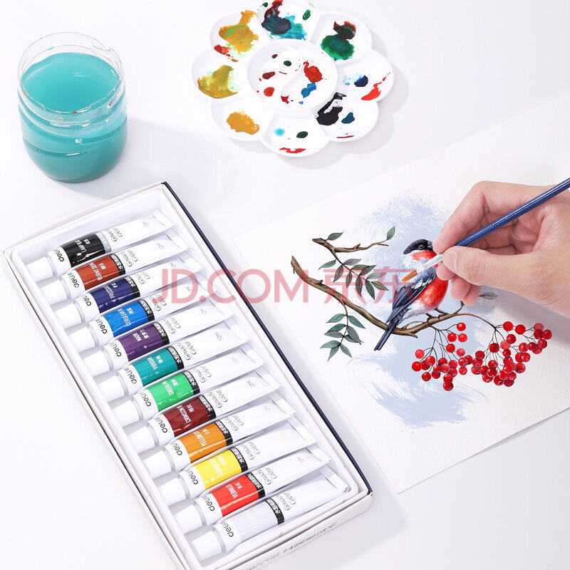 商品相册:得力水粉颜料12色12ml大容量美术专用水粉画学生儿童绘画彩绘套装便携工具色彩73853可水洗手搓颜料第