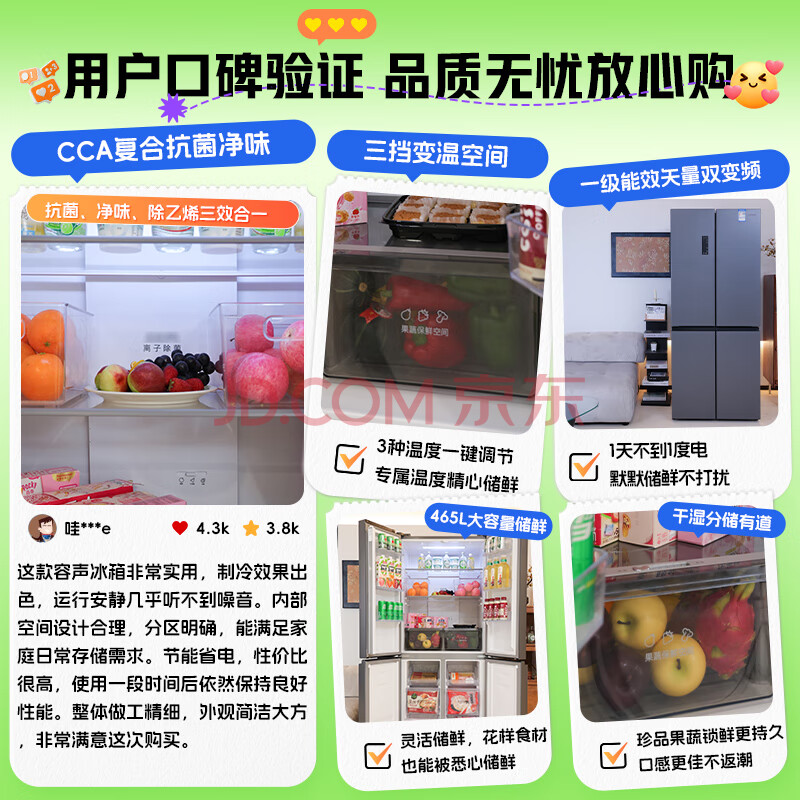 商品相册:容声465L十字门冰箱超薄一级能效风冷无霜双变频节能净味四开门家用BCD-465WD18FP第