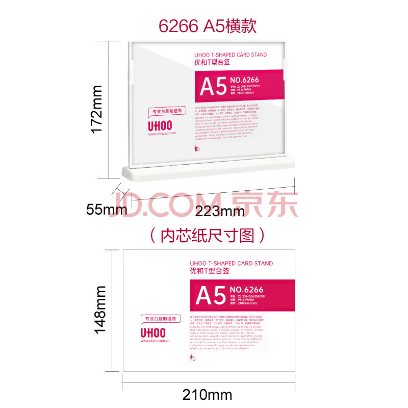 商品相册:优和(UHOO)桌牌 T型亚克力台卡台签架白色透明1个装210mmx148mm A5横款展示牌会议卡6266第