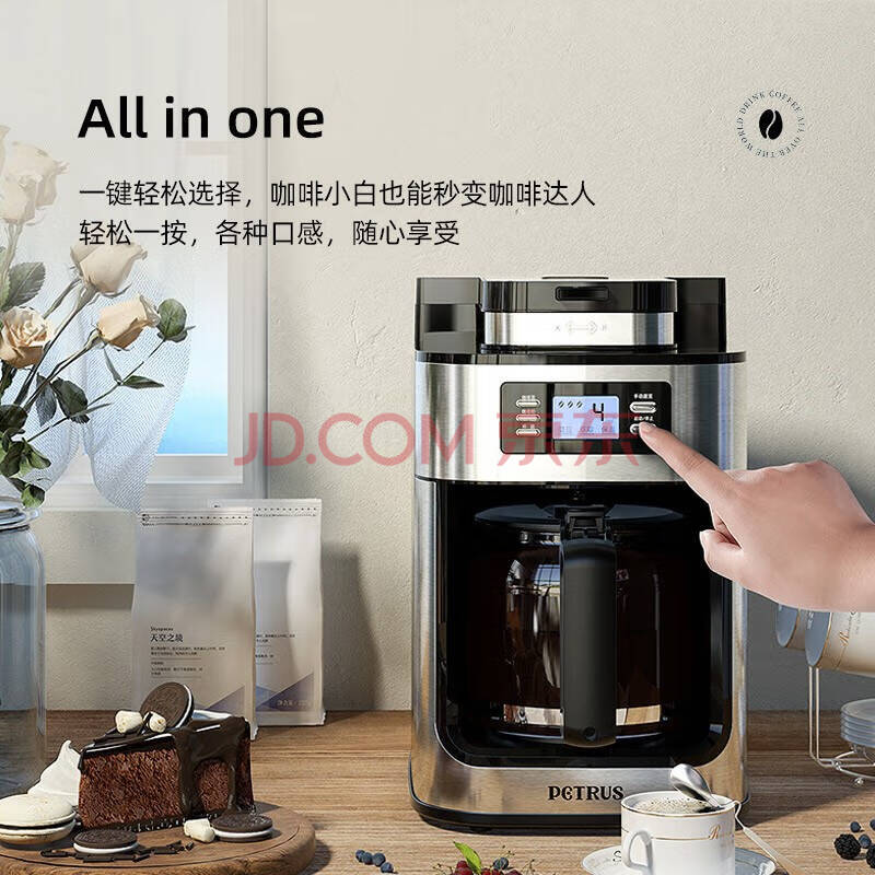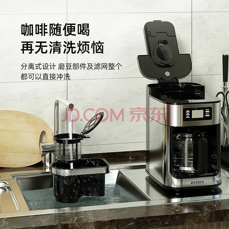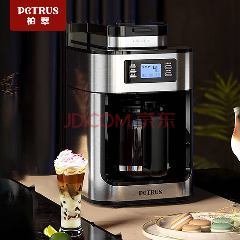 商品相册:柏翠(petrus)PE3200银色 全自动磨豆咖啡机 3档浓度调节 美式滴漏式磨豆研磨一体机 商务小型办公室煮咖啡壶第