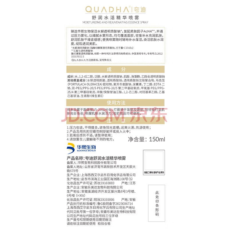 商品相册:夸迪舒润水活精华喷雾150ml 补水保湿爽肤水华熙生物第