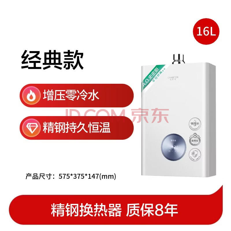 商品相册:史密斯(A.O.SMITH)佳尼特16升精钢零冷水燃气热水器不锈钢换热器包8年负压更安全JSQ31-TJ1 第