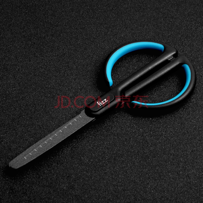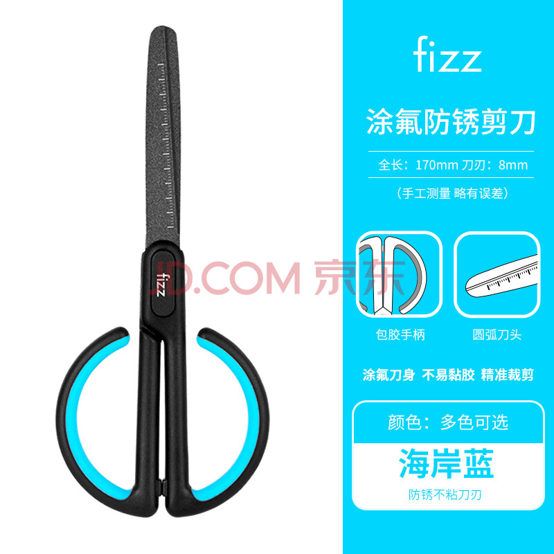 商品相册:飞兹(fizz)特氟龙材质防粘防水不锈钢弧形省力剪刀自带刻度安全圆头办公居家拆快递剪纸天蓝FZ212003第