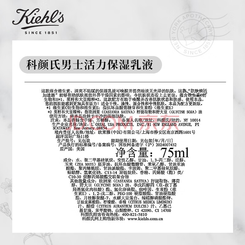 商品相册:科颜氏(Kiehl's)男士活力保湿乳液75ml 补水保湿控油 护肤品 生日礼物第1张/共4