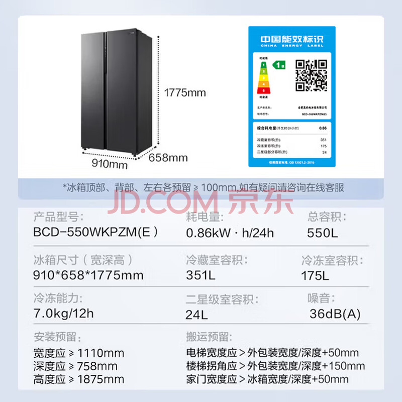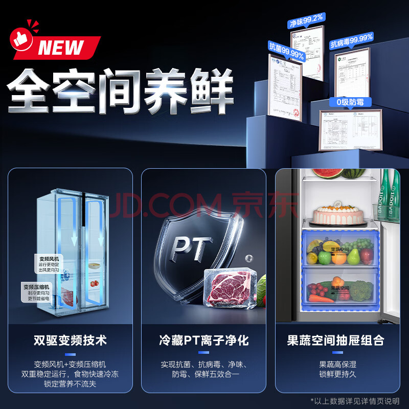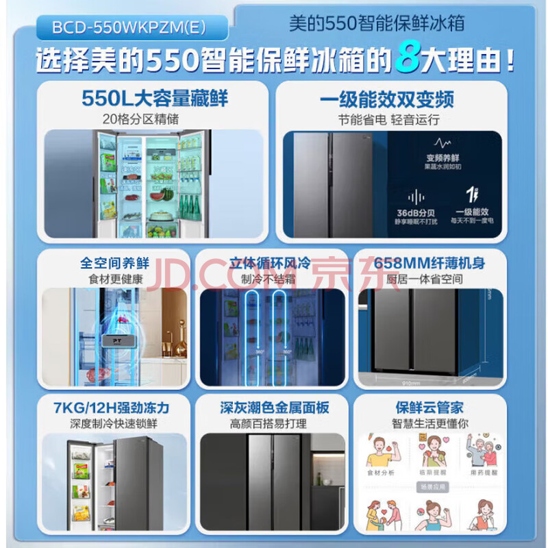 商品相册:美的(Midea)550升对开门冰箱大容量一级能效节能变频风冷无霜冰箱BCD-550WKPZM(E)第