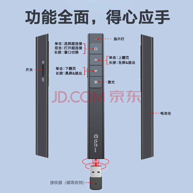 商品相册:汉王(Hanvon)360度控制激光笔 便携式PPT翻页笔 投影笔 无线演示器 电子教鞭笔 B200SM 黑色 红光第