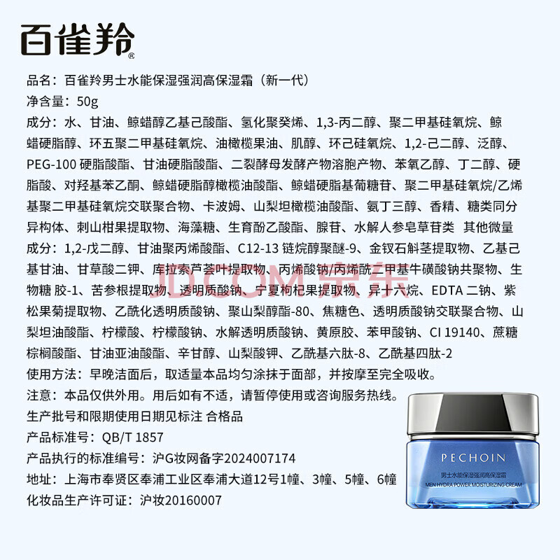 商品相册:百雀羚护肤品水能保湿强润高男士保湿面霜50g润肤擦脸油生日礼物第