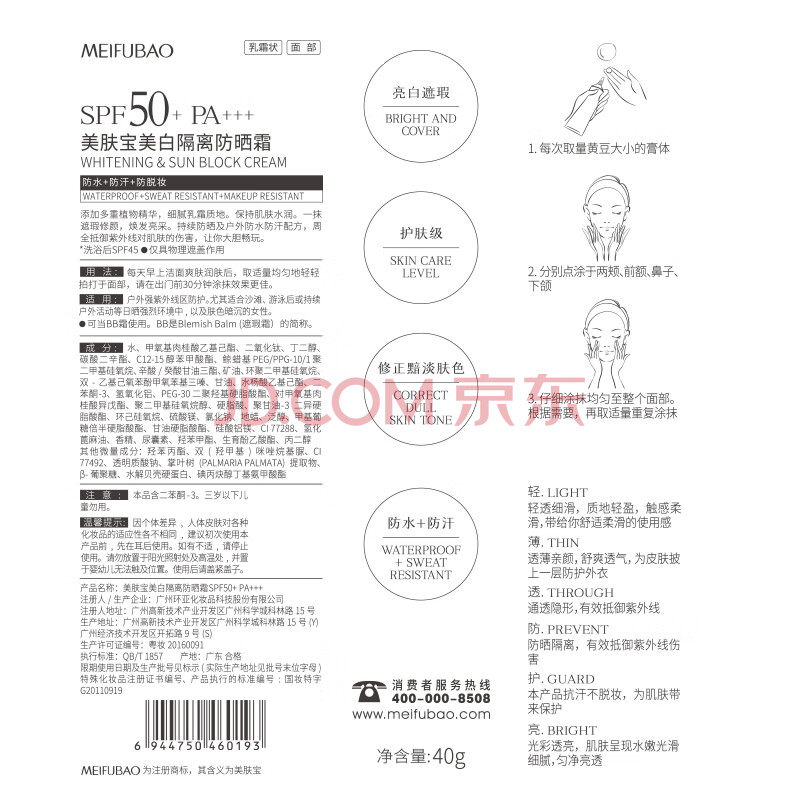 商品相册:美肤宝美白隔离防晒霜SPF50+小粉管40g提亮遮瑕户外防水防汗高倍女第