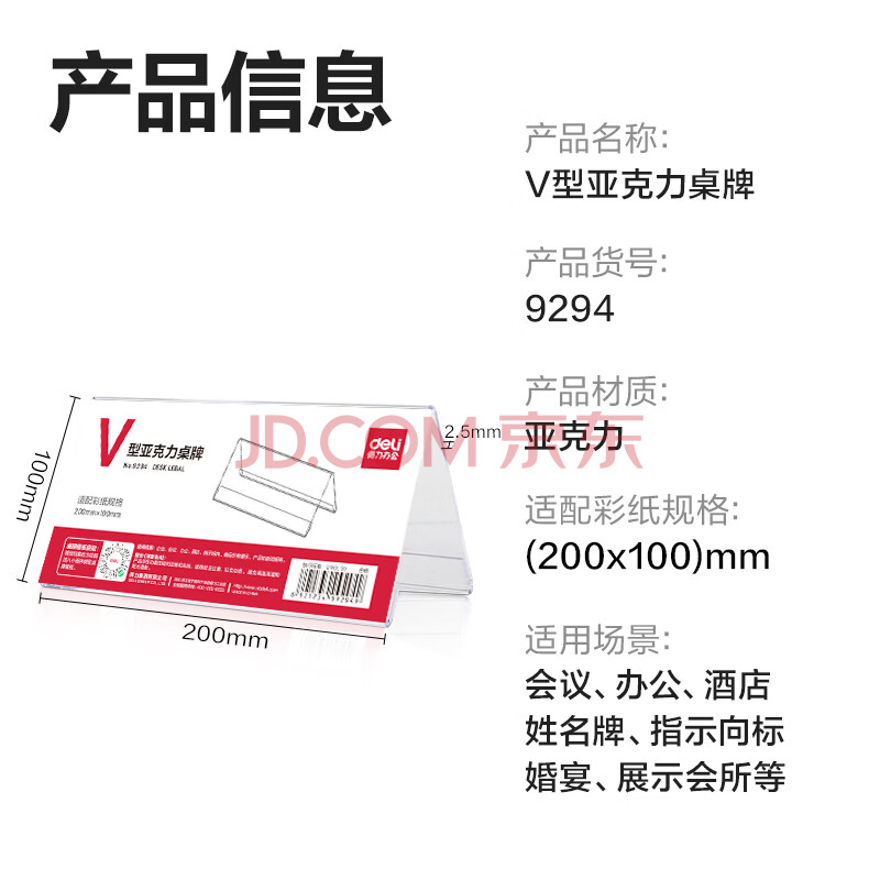 商品相册:得力(deli)V型200*100mm高档亚克力 会议牌席卡桌签三角台卡/立牌/展示牌 姓名牌座位牌 办公用品 9294第
