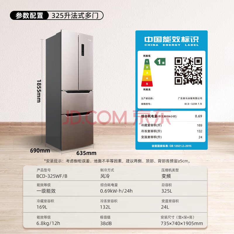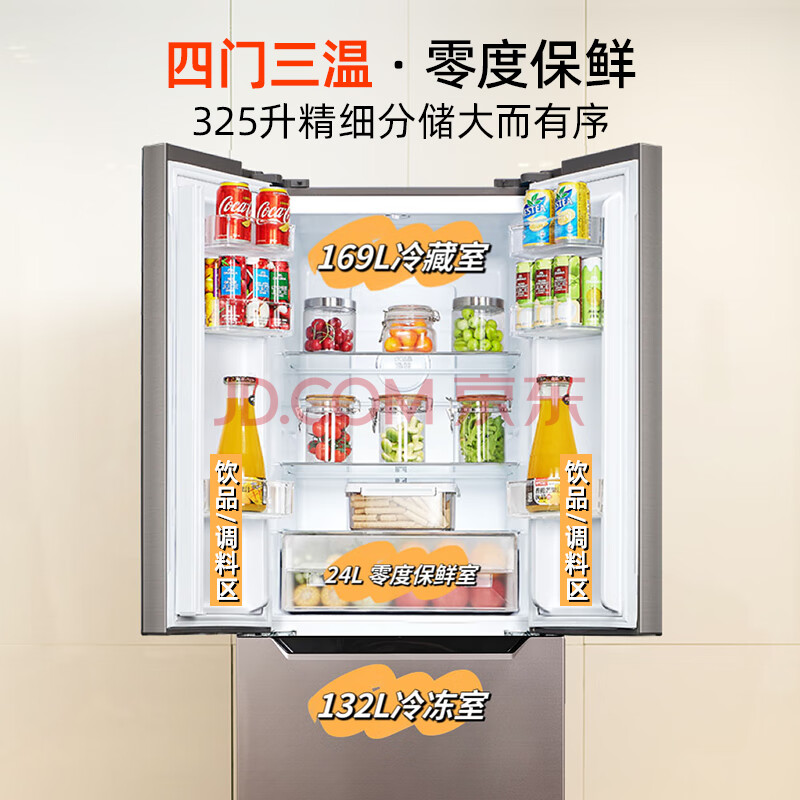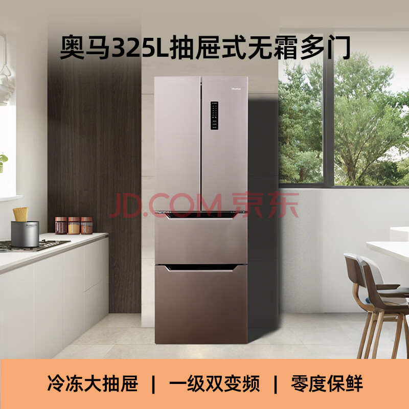 商品相册:奥马(Homa)325升法式多门家用电冰箱一级能效双变频节能风冷无霜大冷冻抽屉双开门四开门325WF/B第