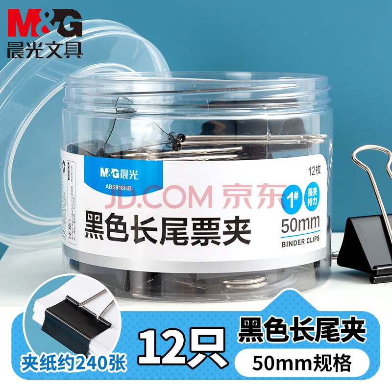 商品相册:晨光(M&G)文具热门商品1#50mm 12只/罐 黑色长尾夹 大号金属票据夹 Eplus系列办公燕尾夹 ABS916NB第