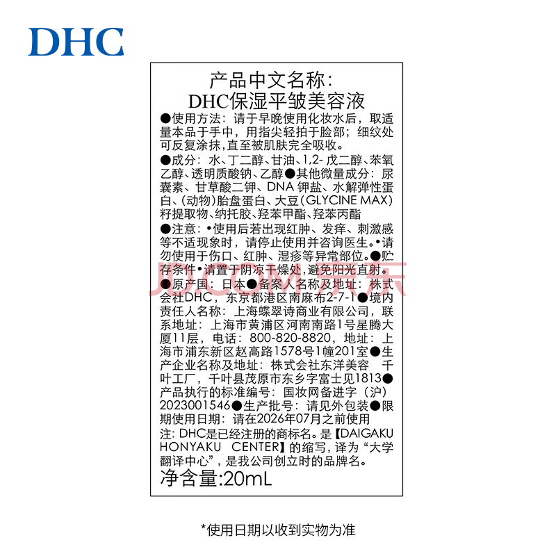 商品相册:DHC保湿平皱美容液20ml 眼部面部精华温和滋润保湿补水紧致改善细纹第