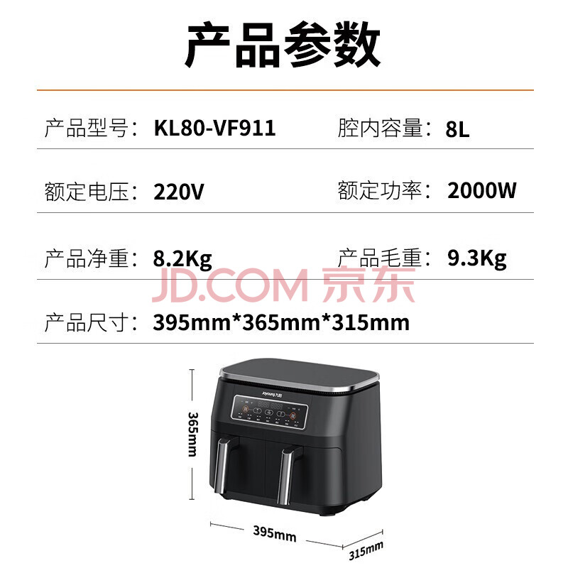 商品相册:九阳(Joyoung)空气炸锅 家用智能多功能 双腔8升大容量 不粘易清洗 无油煎炸电炸锅 KL80-VF911 第