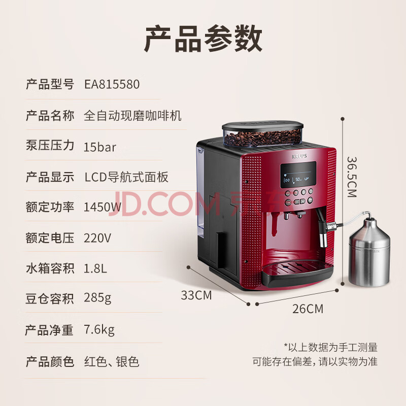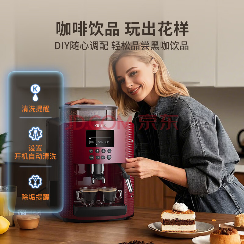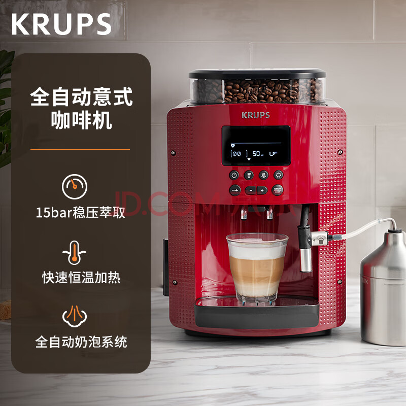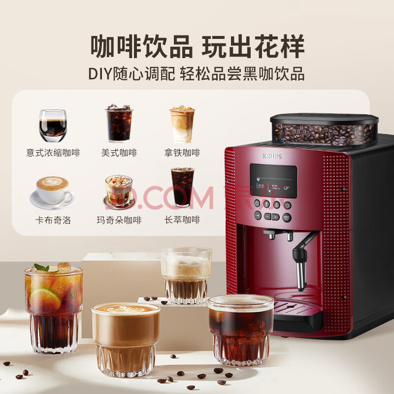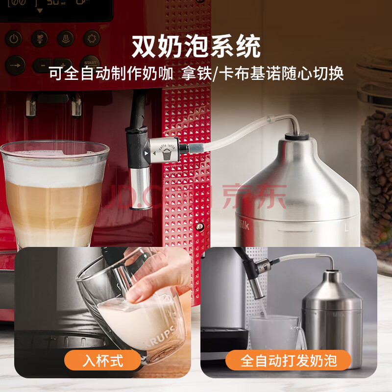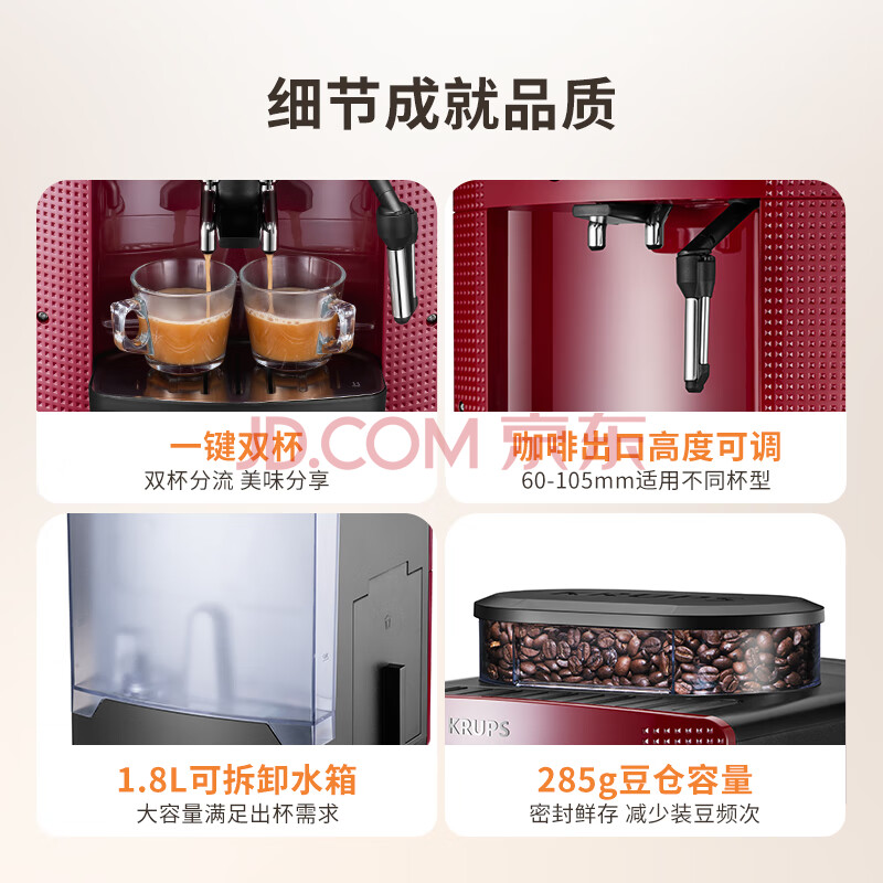 商品相册:krups德国克鲁伯咖啡机家用/办公室全自动咖啡机意式浓缩咖啡研磨一体机欧洲原装进口EA815580(红色)第