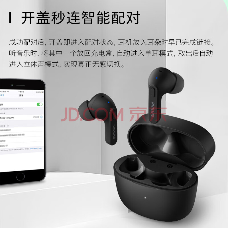 商品相册:飞利浦(PHILIPS)真无线蓝牙耳机无线运动游戏音乐耳机降噪CD级高清音质苹果华为小米手机双11双十一礼物TAT2206黑第