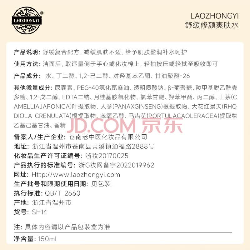 商品相册:老中医舒缓修颜爽肤水150ml 补水保湿舒缓面部泛红 敏感肌红血丝爽肤水第
