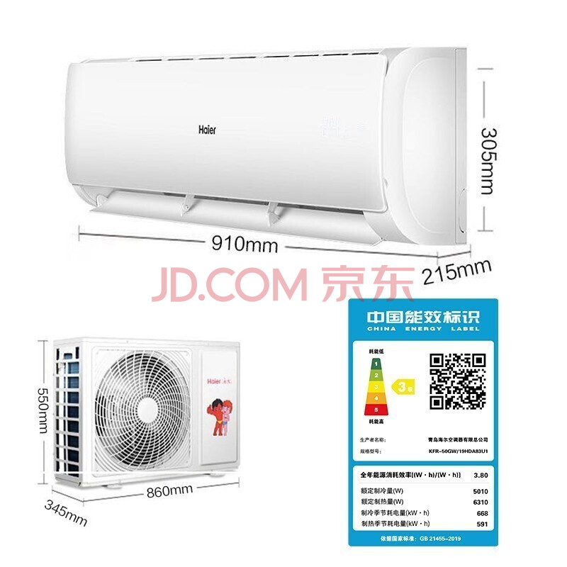 商品相册:海尔(Haier)节能风H系列 2匹变频冷暖壁挂式空调WiFi KFR-50GW/19HDA83U1第