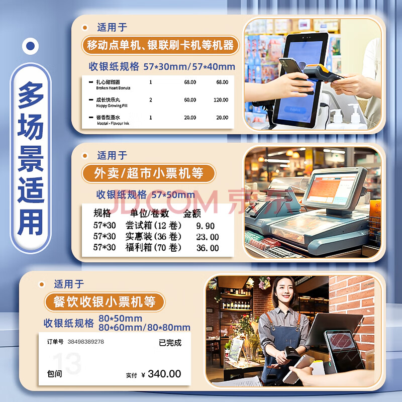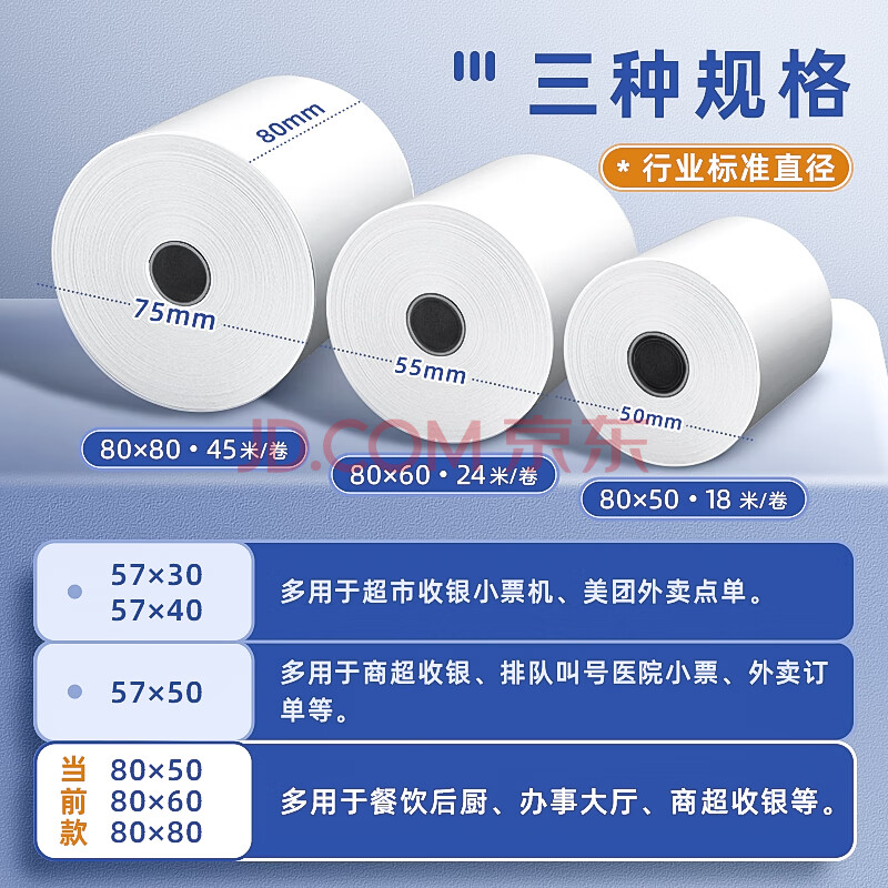 商品相册:金值热敏收银纸打印纸80*60mm 小票打印纸京东美团外卖餐饮酒店超市收银机打印纸50卷(24米/卷) 足米数第