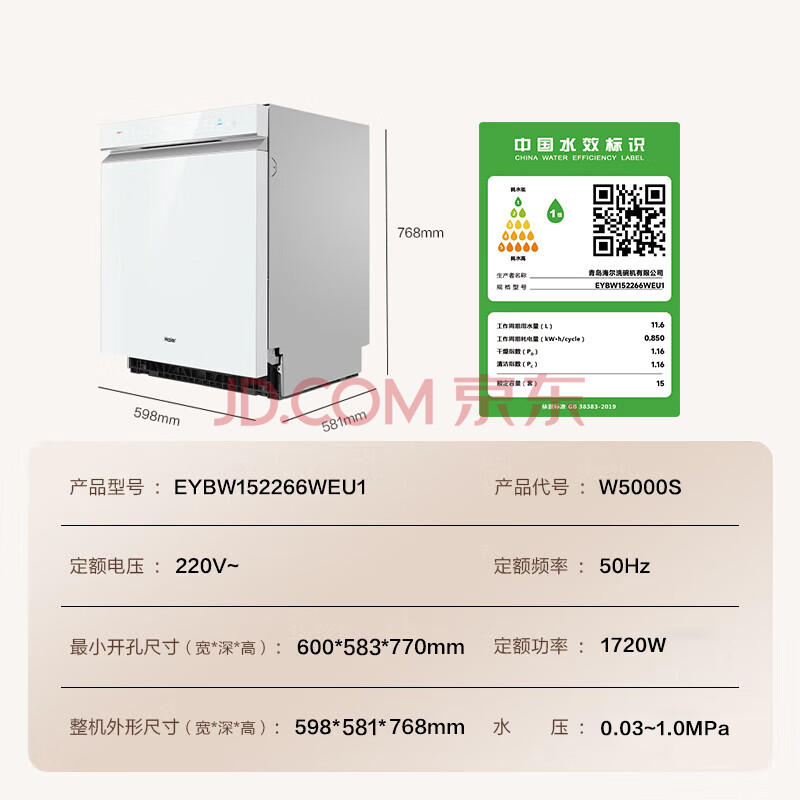 商品相册:海尔(Haier)【W5000S】双面洗嵌入式洗碗机云溪白色15套大容量一级水效智能开门速干 EYBW152266WEU1第