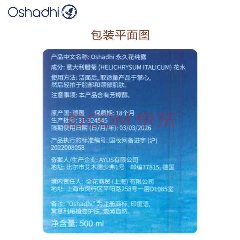 商品相册:OshadhiO家蜡菊永久花纯露500ml闭口粉刺湿敷水爽肤水礼物礼品效期27.4第