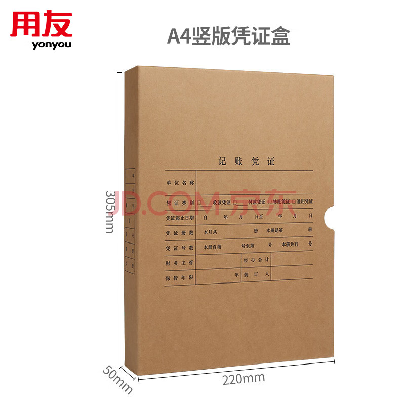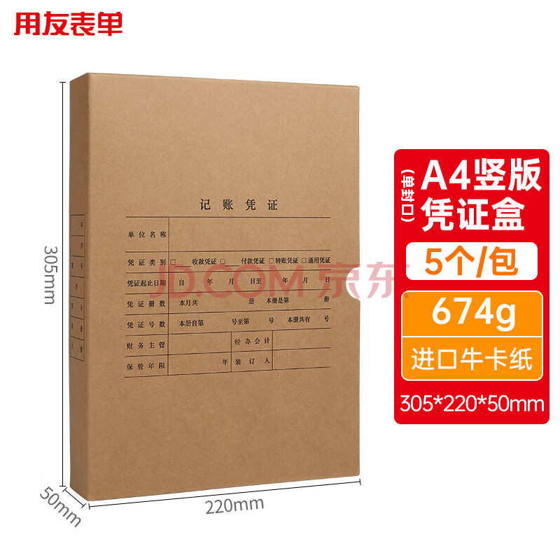 商品相册:用友表单用友A4竖版记账凭证盒 单封口 674g加厚牛卡纸 305*220*50mm 5个/包A4记账凭证会计档案装订盒6704第