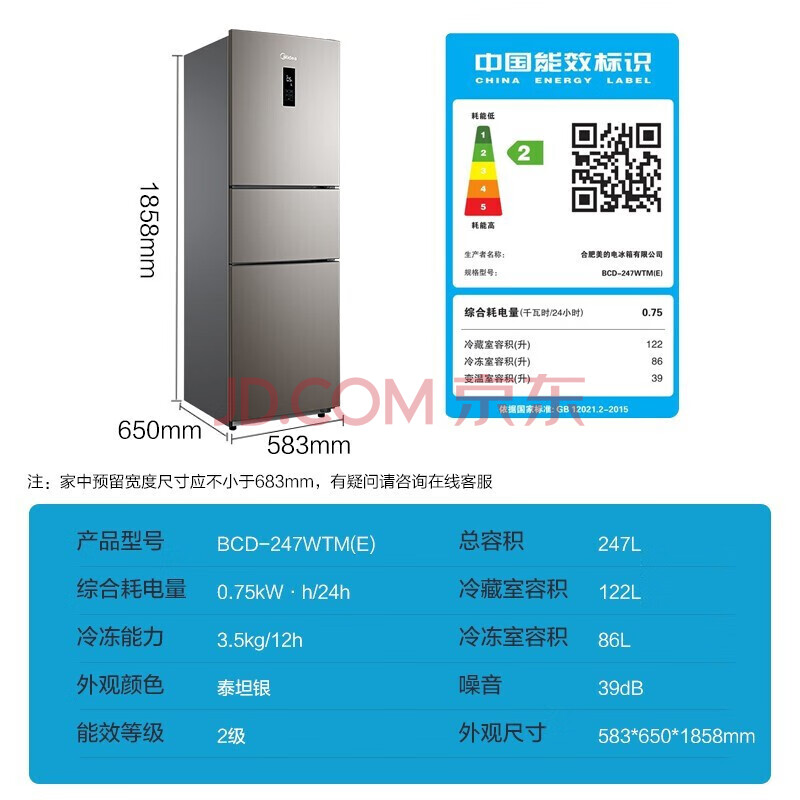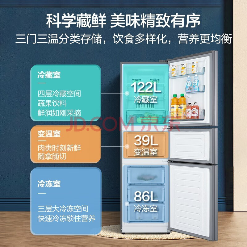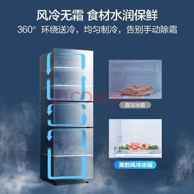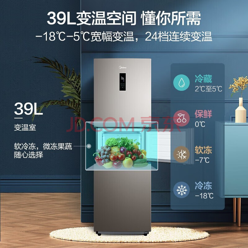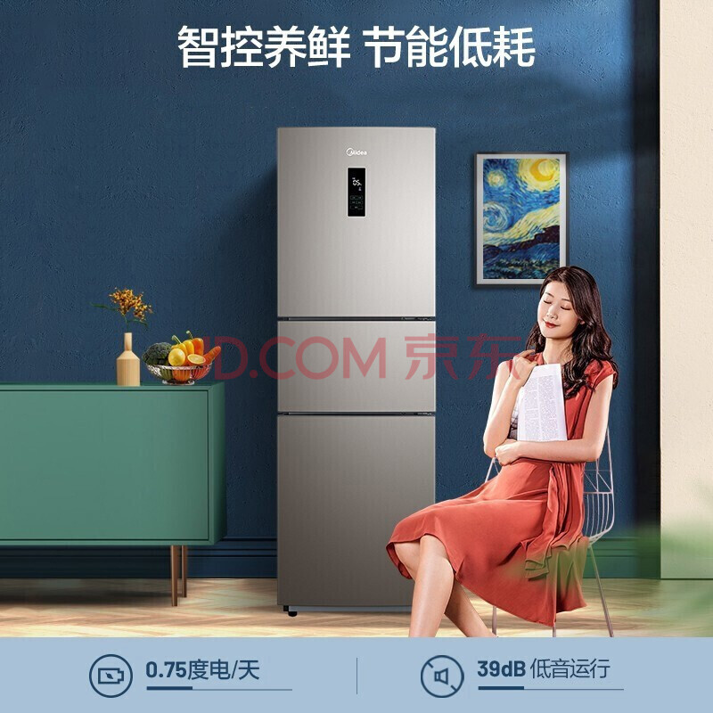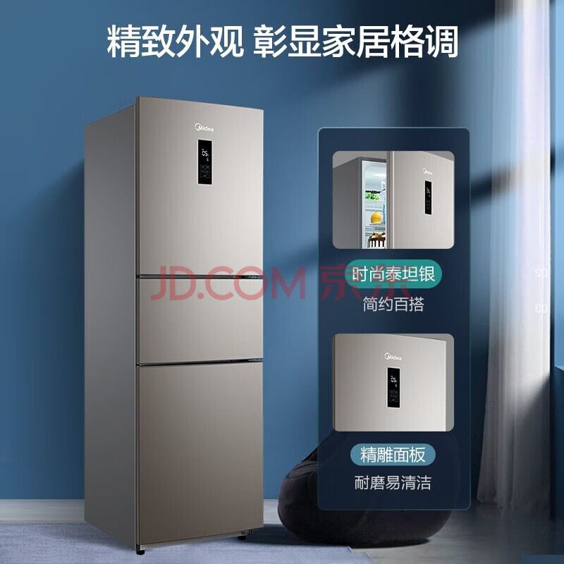 商品相册:美的(Midea)247升三门家用冰箱风冷无霜小冰箱BCD-247WTM(E)全温区变温智能家电节能第