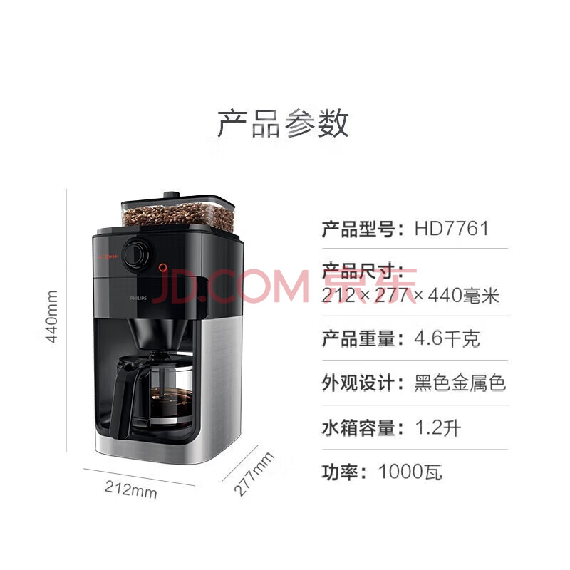 商品相册:飞利浦(PHILIPS)全自动美式咖啡机研磨一体机磨豆机现磨咖啡机家用 智能温控 全自动清洗 送礼HD7761第