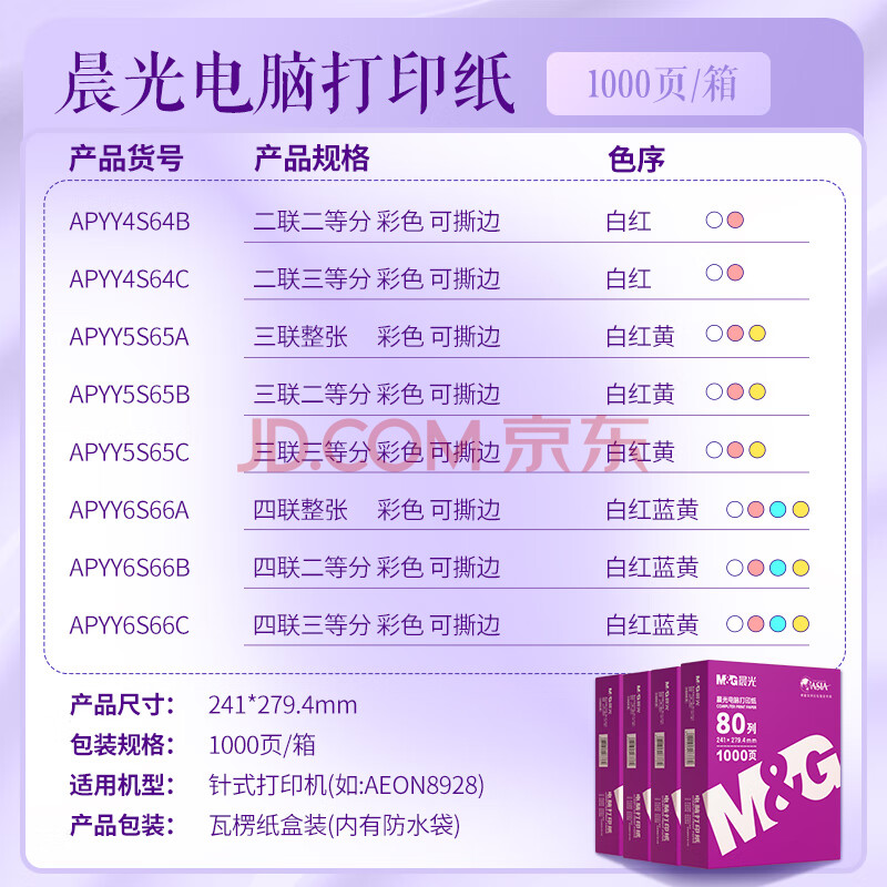 商品相册:晨光(M&G)紫晨光 二联三等分电脑打印纸 彩色针式打印纸241-2-1/3 80列撕边白红出入库送货清单1000页第
