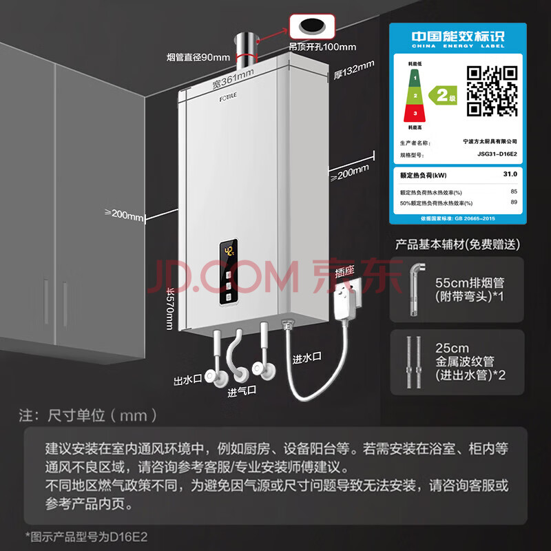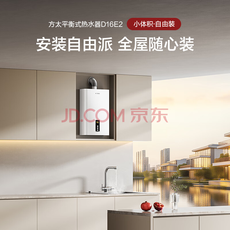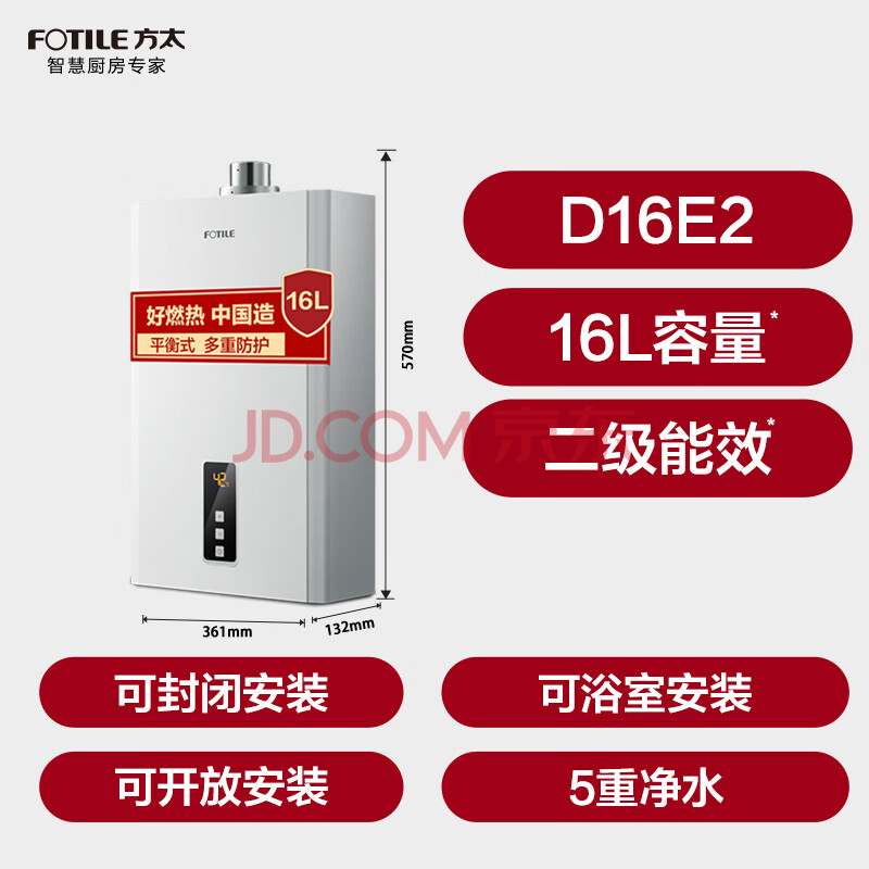 商品相册:方太平衡式燃气热水器16升 抗风防冻 封闭空间可装 浴室可装 寒冷地区可装 恒温洗澡 下置风机 D16E2第