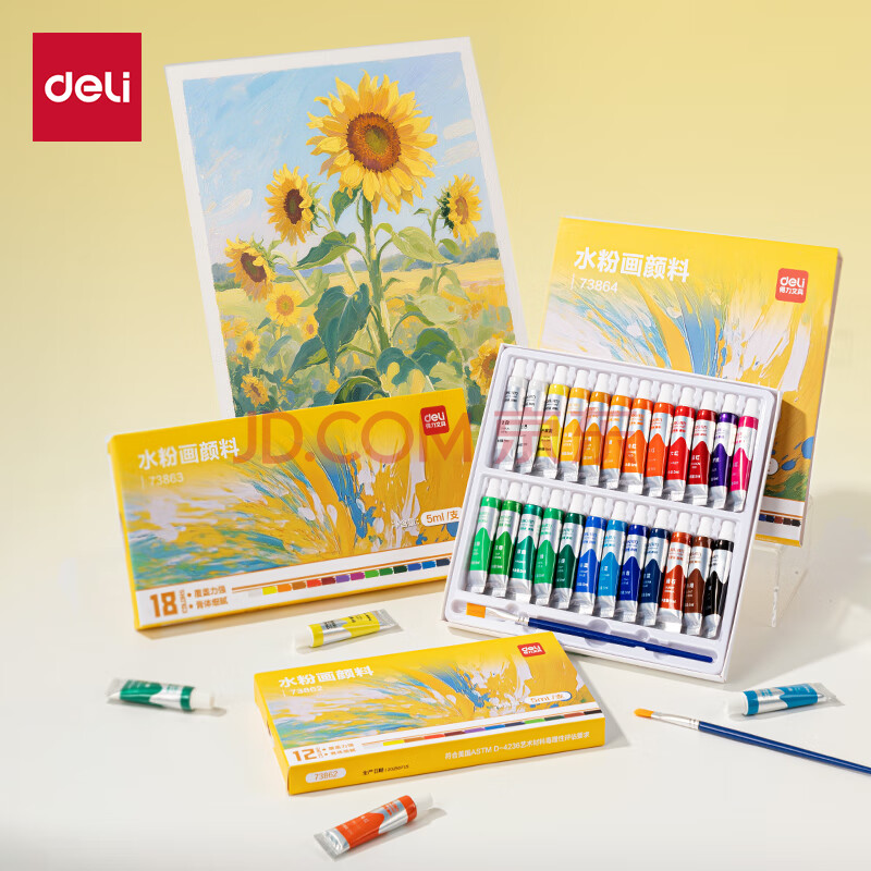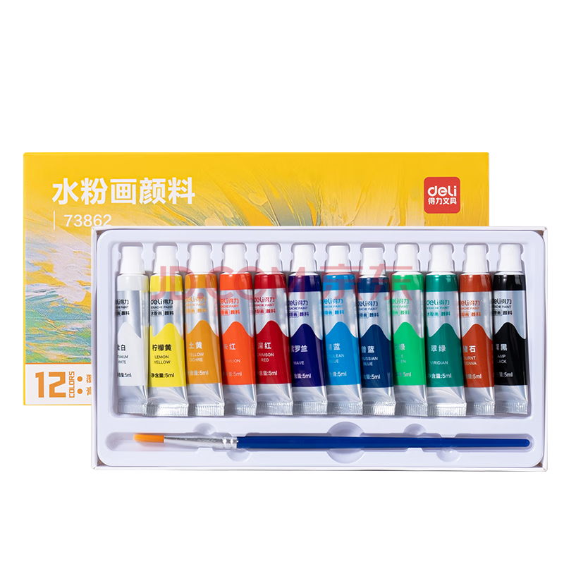 商品相册:得力(deli)水粉颜料12色5ml画画美术专用水粉画学生儿童绘画彩绘套装含画笔可水洗手搓颜料第